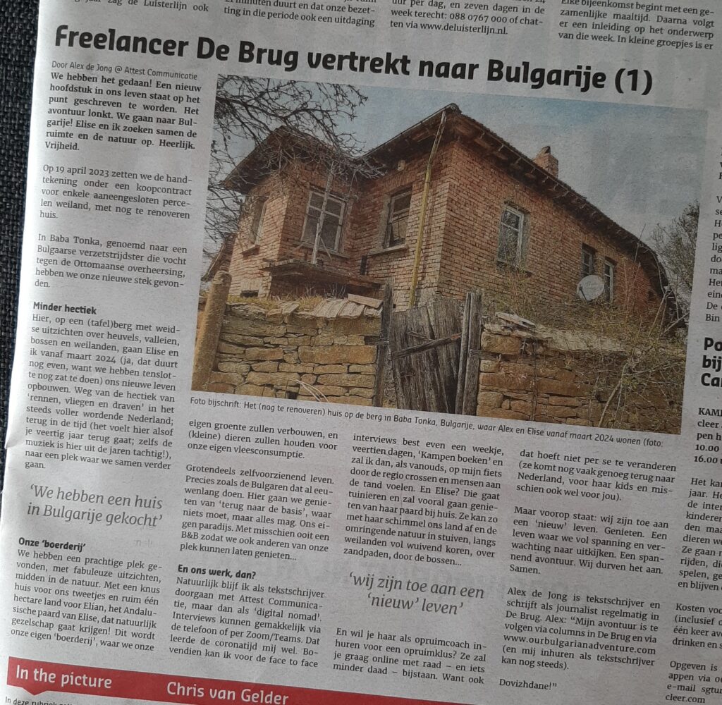 Je kunt ons avontuur volgen via columns in De Brug en via www.ourbulgarianadventure.com (en mij inhuren als tekstschrijver kan nog steeds). Dovizhdane!